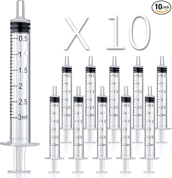 - Quantity: 10 Pack 3ml / 3cc plastic syringe without needle.
